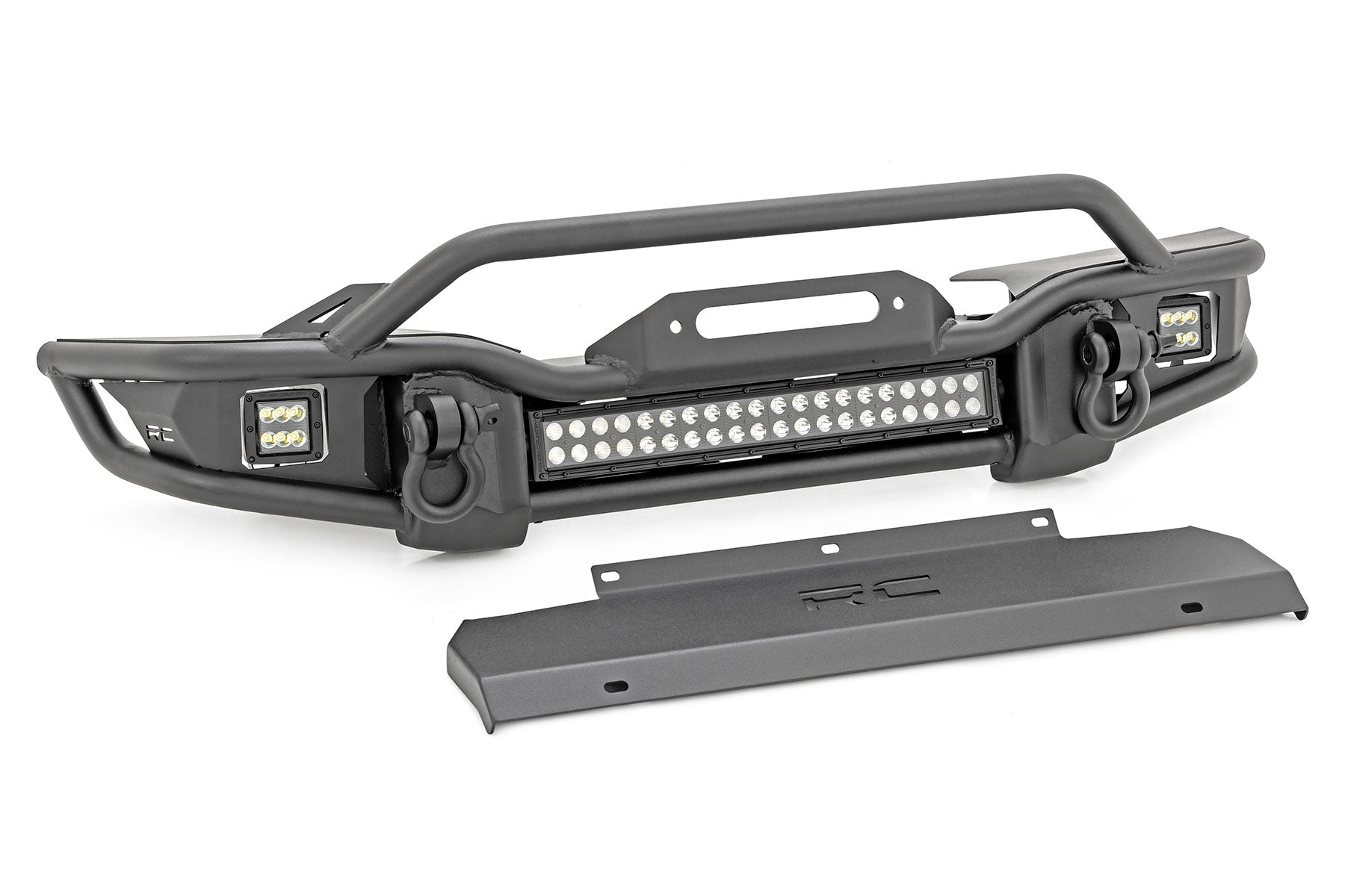 Each kit includes a modular integrated fog light mount that allows you to run the included Rough Country 2-inch led cubes boasting an impressive 2800 lumens and 36 watts. This front bumper also features a built-in Rough Country 20in Dual-Row Black-Series LED Light Bar, providing 9,600 lumens and 120 watts of forward-facing illumination to help you easily see the trail ahead.\