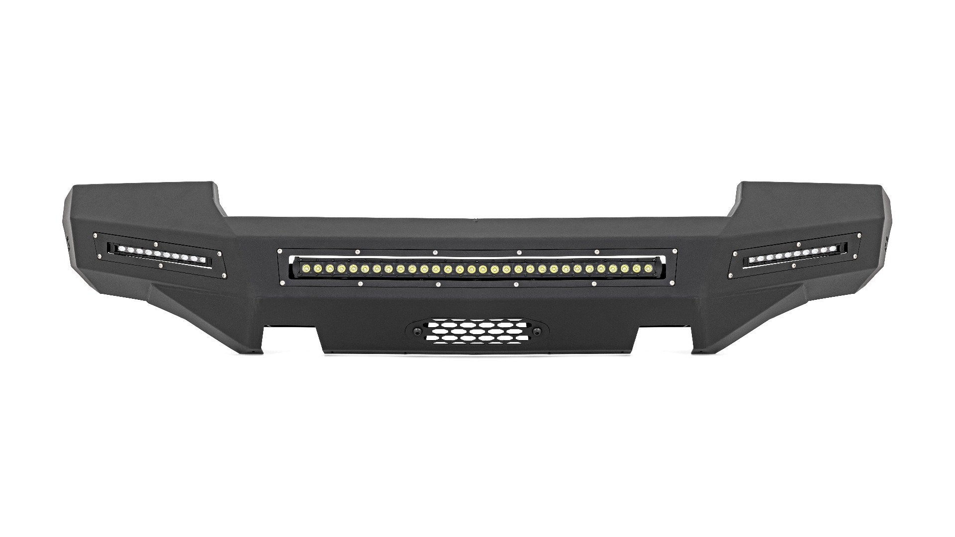 Rough Country's High Clearance Bumper is modular, you can pick and choose the options best suited to your needs and the look you're going for. Each bumper features trim plates and mounting options that allow you to run a series of LED lights for impressive illumination and includes a winch mounting plate. Optional LED upgrade kit includes (1) 30in Single Row LED and (2) 10in Slimline LEDs. For a more classic look, simply use the provided trim panels for a sleeker appearance.\