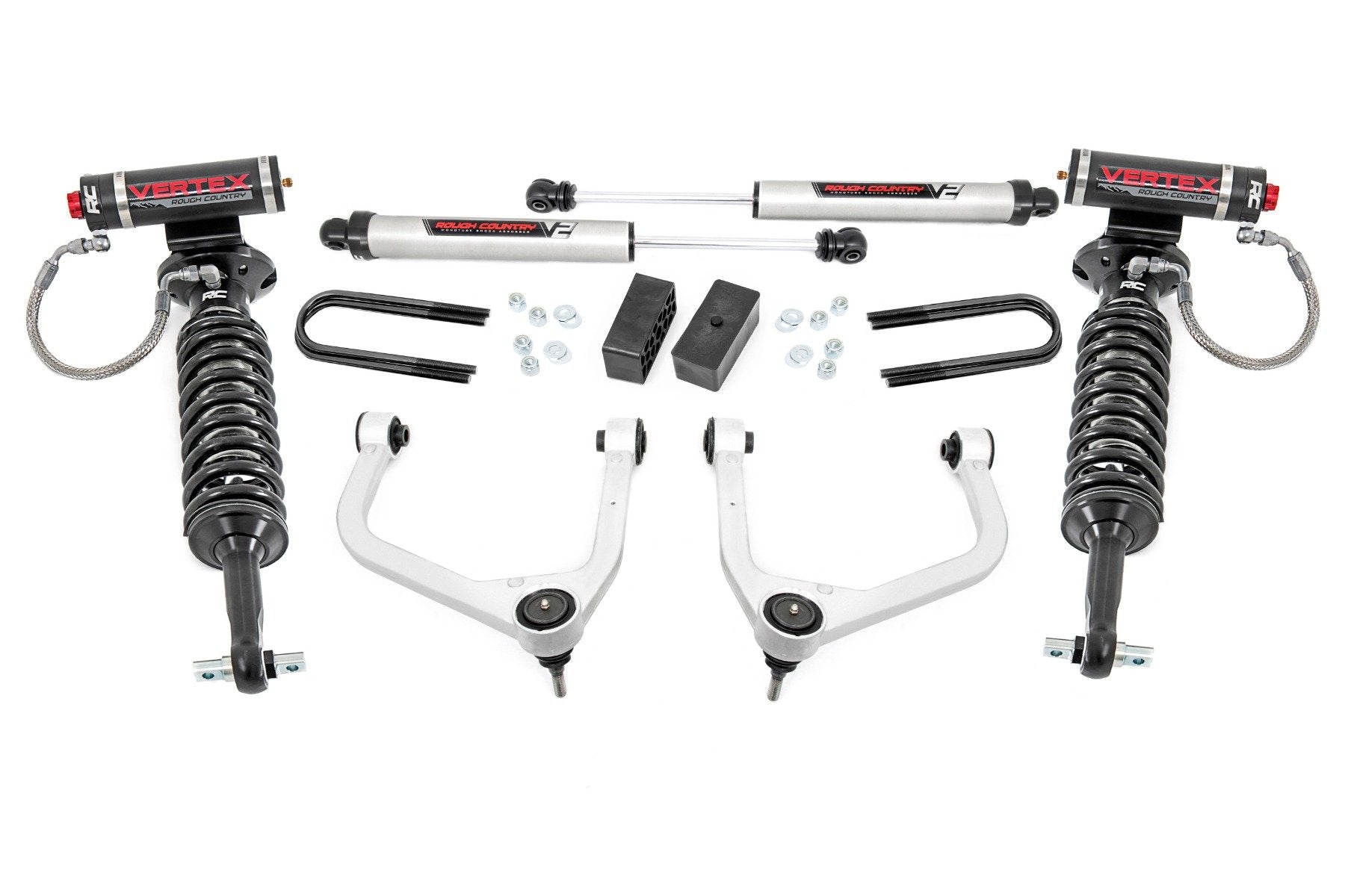 Explore New Heights: GMC's fifth-generation Sierra 1500 features an impressive all-new design that's built from the ground up, with aggressive angles and head-turning stylings that fit in beautifully when transformed with Rough Country's 3.5-inch Suspension Lift.Innovative Design and Construction: When changing a vehicle's suspension, the key to preserving ride quality is keeping the geometry of all suspension components as close to their factory angles as possible. Rough Country's 3.5in lift features a set of forged aluminum upper control arms to provide the correct suspension geometry in our most durable control arm to date! This perfect-height lift is a great choice for anyone who wants more than a simple level but doesn't quite want the full height of a 6-inch option. This kit lifts and levels the front of the vehicle with the rear, offering enough increased ground clearance to run up to 295/55R20 tires with an improved, aggressive look. We didn't want to limit you to one standard kit. Rough Country's 3.5-inch kit is configurable with all the shock options that we offer. This allows you to choose which shock series you want! Ranging from our nitrogen-charged N3 shocks to our Vertex reservoir shocks the power to choose is in your hands.Installation: Requiring the use of a strut compressor to install, an estimated timeframe of 5-6 hours is recommended to complete this full installation. This full kit can be installed at home and can be completed efficiently and quickly!Limited Lifetime Replacement Warranty: Rough Country's 3.5" Suspension Lift Kit is backed with a limited lifetime replacement warranty towards manufacturer defects. As such, the product is protected from structural and workmanship damage after the date of purchase. With our industry-leading warranty give yourself peace of mind when using Rough Country's Suspension products!