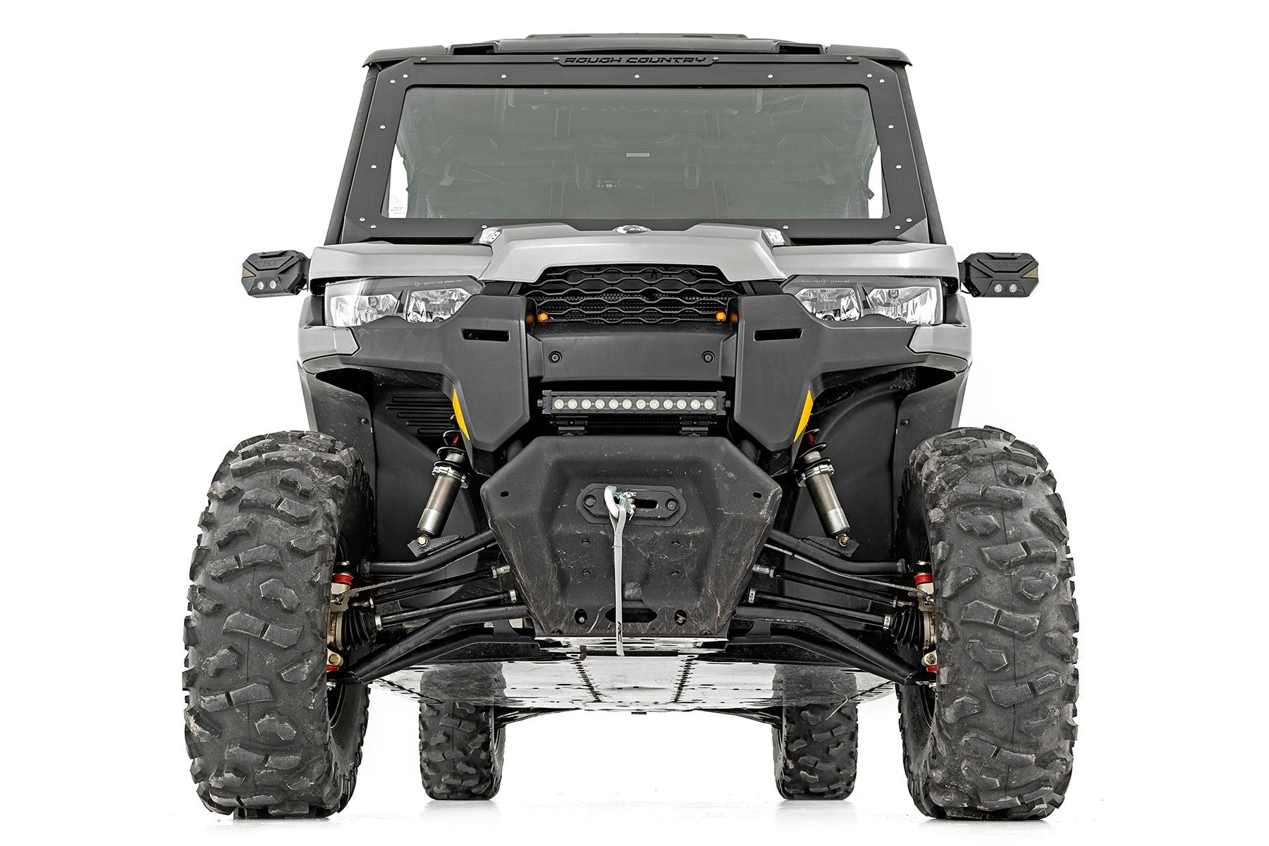 Improved Stance, Balance, and Handling.If you want to improve your Can-Am Defender's on-road performance and off-road capabilities, Rough Country's M1 Coilovers are the way to go. Our M1 Coilovers help stabilize your vehicle's movements, enhancing control when you turn, brake, accelerate or ride over uneven surfaces. As an adjustable ride height shock, these M1's keep your suspension from overextending, providing a more consistent ride. Made for rugged off-road performance, our M1 monotube shocks have a 46mm digressive piston for a more stable ride, preserving the smooth ride quality you need.\ Quality Construction.Rough Country's M1 Coilovers have been engineered to give you the most reliable performance, increased driving comfort, and all-around performance for your UTV. Made from 2" seamless extruded tubing and feature durable vulcanized natural rubber bushings. They're also zinc plated for resistance against the elements. Plus, they're adjustable in height. Utilizing multiple grooves in the shock body the spring perch can be raised or lowered to achieve additional height or simply function as a stock height replacement. So whether you're looking to add a little extra clearance for off-roading or just want your ride to sit a little higher, our M1 Coilovers are the perfect solution.\ Installation and Warranty. This bolt-on installation requires just basic tools and about 2-3 hours to complete. Our M1 Coilover Kit is backed with a three year replacement warranty towards manufacturer defects. As such, the product is protected from structural and workmanship damage after the date of purchase. With our industry-leading warranty, give yourself peace of mind when using Rough Country's products!