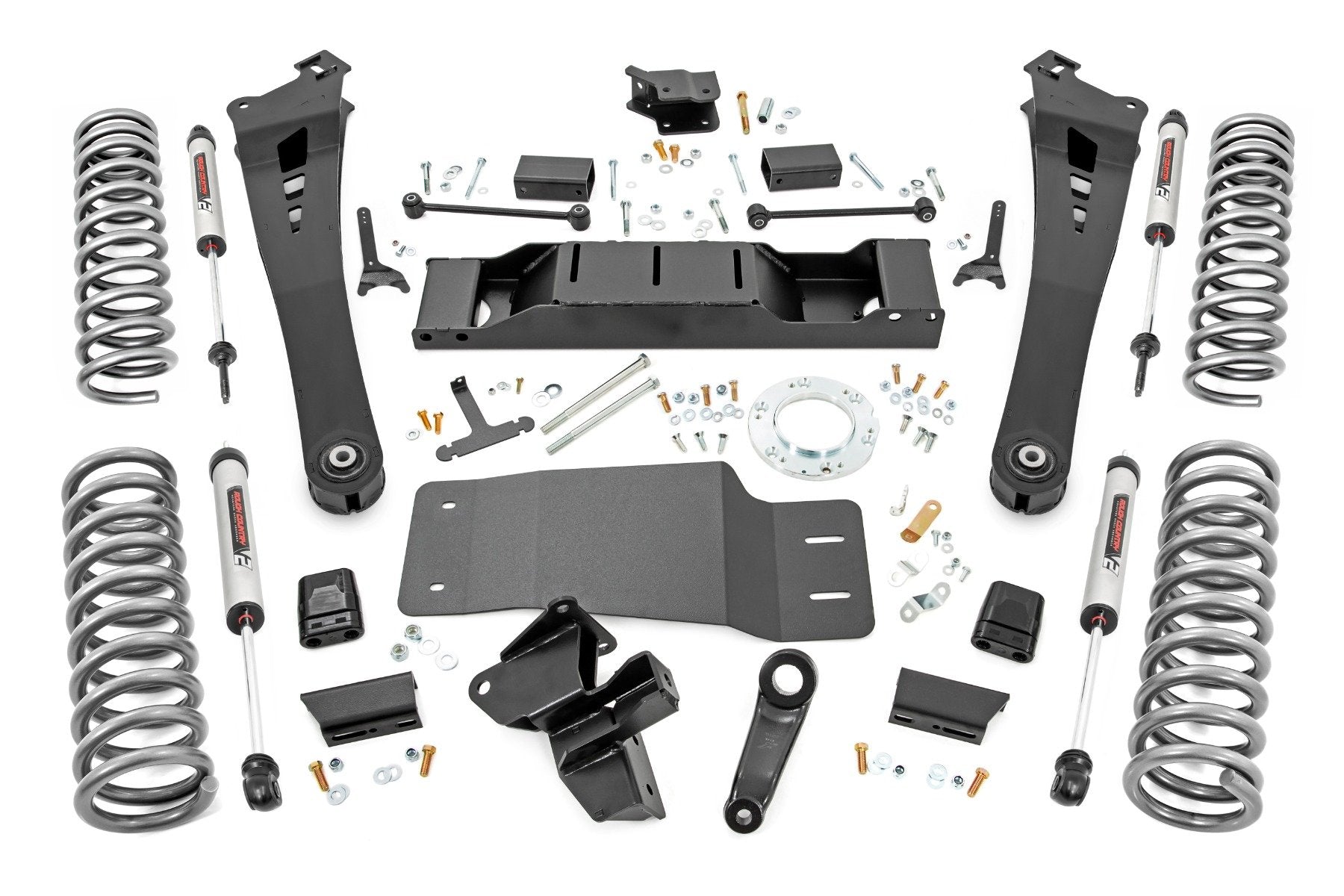 Compliment your RAM 2500's aggressive, good looks with Rough Country's new 5-inch Lift Kit with lifted coil springs. New model RAM Trucks come with a wealth of impressive features right from the factory. Rough Country's new 5-inch kit was engineered to retain these impressive factory specs while bumping up performance and durability where it's needed most. The result is a lifted beast with a mean profile and lush ride-quality that'll make other RAM owners wonder where you got yours from!\ When changing a vehicle's suspension, the key to preserving ride quality is in keeping the geometry of all suspension components as close to their factory angles as possible. Rough Country's new 5-inch Suspension kit features a set of ultra-durable Radius Arms, precision fit to bolt right into the factory mounts for an easier install and a more factory-like angle. These beefy, upgraded Radius Arms also feature a durable, durable rubber bushings for maximum vibration absorption. This kit also includes a skid plate and a set of front and rear dual-rate lifted coil springs for unparalleled ride quality from your lifted Dodge Ram. The Dual Rate coil srpingsacombine a relatively low initial spring rate, designed to absorb minor undulations and increase grip with a precise transition point and transition range to a secondary higher spring rate to improve handling and driveability.a