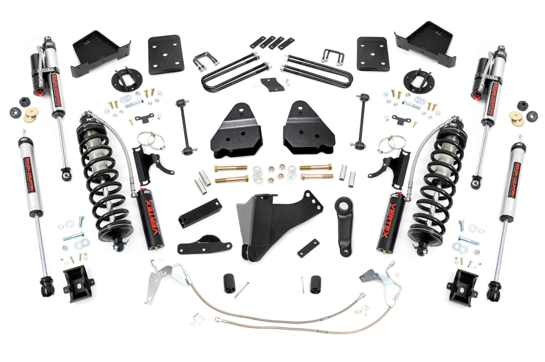 Explore New Heights. Give your second-generation Ford Super Duty superior lift height with Rough Country's 4.5-inch Coilover Suspension Lift Kit! This all-inclusive kit comes with everything you need for a total transformation of your truck. Run up to 35in tires while preserving the smooth, factory ride quality with this impressive upgrade.\ Durable Components. When changing a vehicle's suspension, the key to preserving ride quality is keeping the geometry of all suspension components as close to their factory angles as possible. Rough Country's new 4.5-inch Suspension Lift features a set of ultra-durable radius arm drop brackets, precision fit to bolt right into the factory mounts for an easier install and a more factory-like angle. Utilizing this conversion kit you're removing the factory independent coil shock and coil set-up and replacing it with a massive 2.5in piston, nitrogen-charged, 8-stage adjustable Vertex Coilover. Rough Country's Vertex Coilovers feature a monotube design with an external reservoir for increased oil capacity and damping sensitivity. When it comes to investing in a high-end kit, you'll be pleased to find that Rough Country's 2.5in piston design is beefier and offers an impressive 56% greater fluid capacity than the average reservoir shock. Each kit is paired with a monotube shock that provides optimal damping control.\ Installation. Requiring cutting and drilling to install, an estimated timeframe of 6-10 hours is recommended to complete this full installation. This full kit can be installed at home and can be completed efficiently and quickly!\ Limited Lifetime Replacement Warranty. Rough Country's 4.5-inch Coilover Suspension Lift Kit is backed with a limited lifetime replacement warranty towards manufacturer defects. As such, the product is protected from structural and workmanship damage after the date of purchase. With our industry-leading warranty give yourself peace of mind when using Rough Country's Suspension products!
