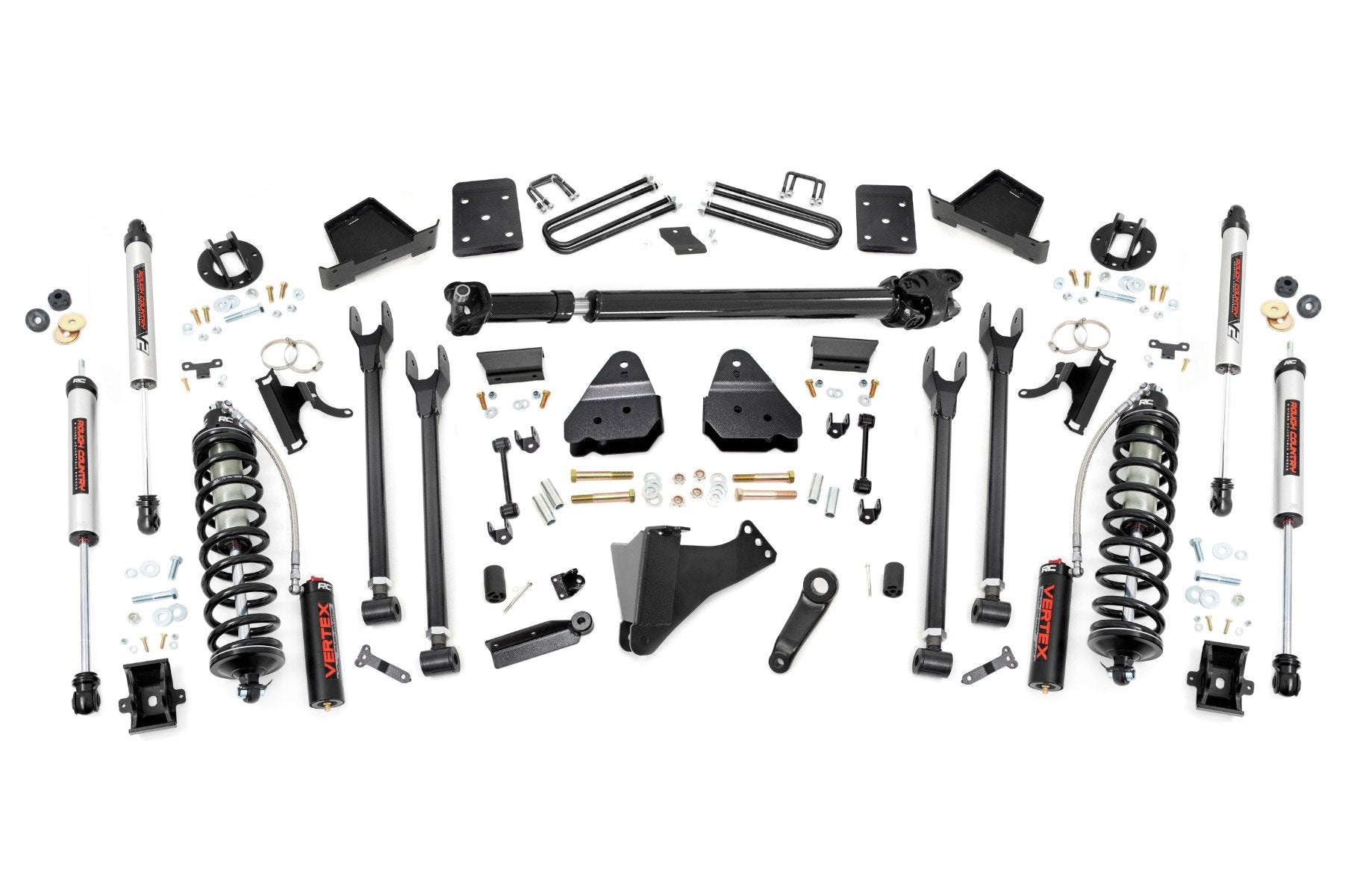 Superior Ride Quality. Give your fourth-generation Ford Super Duty an impressive upgrade and incredible ride quality with Rough Country's 4-Link Coilover Conversion Lift Kit! This must-have kit is the pinnacle of suspension upgrades. Providing ride height adjustability, increased dampening, and killer good looks. You're sure to set yourself apart from the pack. This innovative kit allows you to replace your factory arms with a 4-Link setup, using Rough Country's durable, fixed upper arms and adjustable lower control arms. A set of radius arm drop brackets maintain proper geometry and allow for proper caster setting, which is crucial to maintaining factory handling.\ Durable Components. Rough Country's 6" 4-Link Coilover Conversion Lift Kit features top-mounted reservoir brackets and coil-over mounts constructed from 1/4-inch steel. Utilizing this conversion kit you're removing the factory independent coil shock and coil set-up and replacing it with a massive 2.5in piston, nitrogen-charged, 8-stage adjustable Vertex Coilover. Rough Country's Vertex Coilovers feature a monotube design with an external reservoir for increased oil capacity and damping sensitivity. When it comes to investing in a high-end kit, you'll be pleased to find that Rough Country's 2.5in piston design is beefier and offers an impressive 56% greater fluid capacity than the average reservoir shock. Each kit is paired with a monotube shock that provides optimal damping control.\ Installation. Requiring cutting and drilling to install, an estimated timeframe of 6-10 hours is recommended to complete this full installation. This full kit can be installed at home and can be completed efficiently and quickly!\ Limited Lifetime Replacement Warranty. Rough Country's 4-Link Coilover Conversion Lift Kit is backed with a limited lifetime replacement warranty towards manufacturer defects. As such, the product is protected from structural and workmanship damage after the date of purchase. With our industry-leading warranty give yourself peace of mind when using Rough Country's Suspension products!
