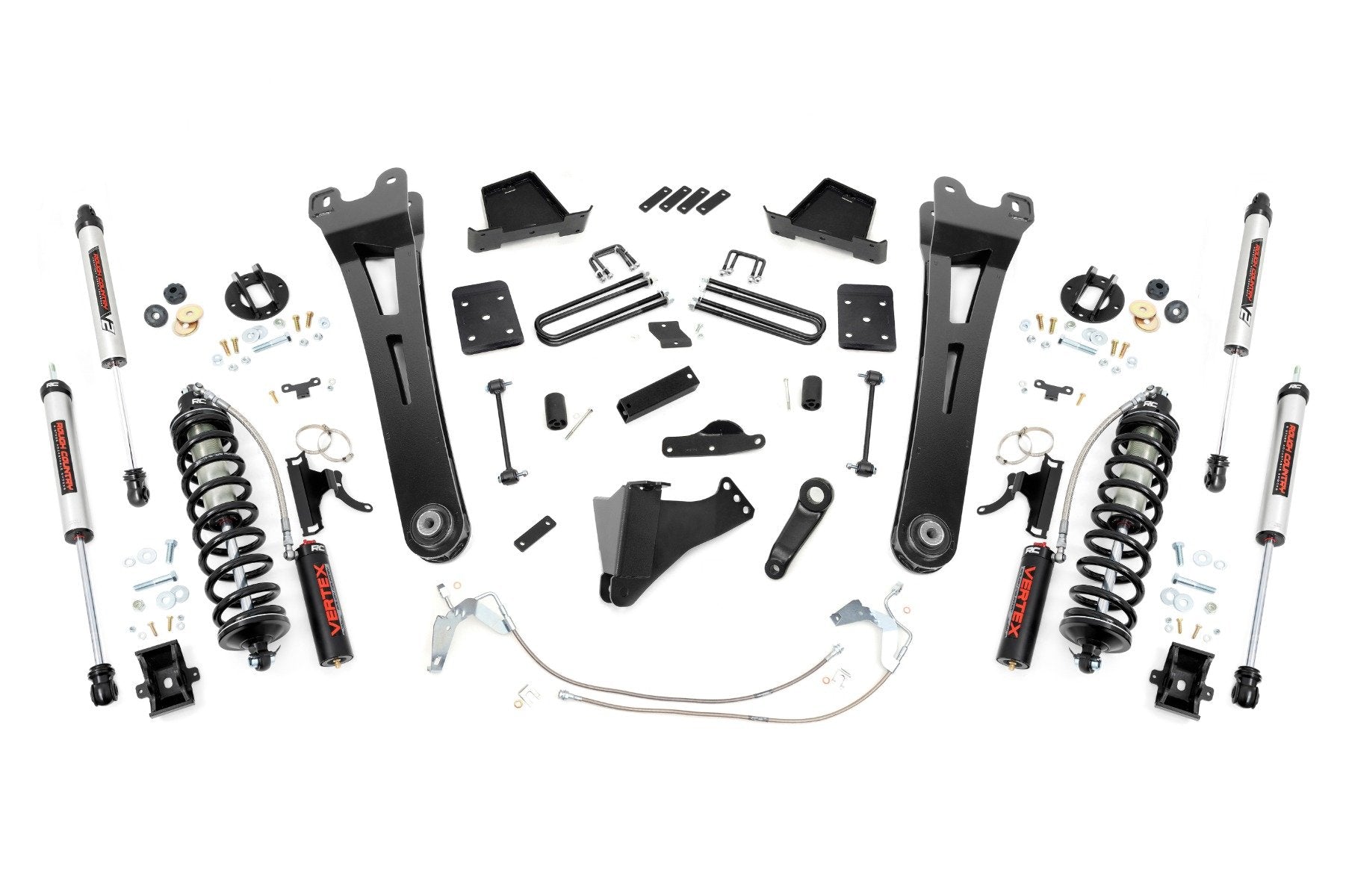 Superior Ride Quality. Take your second-generation Ford Super Duty to new heights with Rough Country's 6-inch Radius Arm Coilover Conversion Suspension Lift! This all-inclusive kit comes with everything you need for a total transformation of your truck. Run up to 37in tires while preserving the smooth, factory ride quality with this impressive upgrade.\ Durable Components. When changing a vehicle's suspension, the key to preserving ride quality is keeping the geometry of all suspension components as close to their factory angles as possible. Rough Country's new 6-inch Radius Arm Suspension Lift features a set of ultra-durable Radius Arms, precision fit to bolt right into the factory mounts for an easier install and a more factory-like angle. At 27lbs each, these beefy, upgraded Radius Arms dwarf stock equipment and feature durable durable rubber bushings for maximum vibration absorption. Rough Country's 6" Radius Coilover Conversion Lift Kit features top-mounted reservoir brackets and coil-over mounts constructed from 1/4-inch steel. Utilizing this conversion kit you're removing the factory independent coil shock and coil set-up and replacing it with a massive 2.5in piston, nitrogen-charged, 8-stage adjustable Vertex Coilover. Rough Country's Vertex Coilovers feature a monotube design with an external reservoir for increased oil capacity and damping sensitivity. When it comes to investing in a high-end kit, you'll be pleased to find that Rough Country's 2.5in piston design is beefier and offers an impressive 56% greater fluid capacity than the average reservoir shock. Each kit is paired with a monotube shock that provides optimal damping control.\ Installation. Requiring cutting and drilling to install, an estimated timeframe of 6-10 hours is recommended to complete this full installation. This full kit can be installed at home and can be completed efficiently and quickly!\ Limited Lifetime Replacement Warranty. Rough Country's 6-inch Radius Arm Coilover Conversion Suspension Lift Kit is backed with a limited lifetime replacement warranty towards manufacturer defects. As such, the product is protected from structural and workmanship damage after the date of purchase. With our industry-leading warranty give yourself peace of mind when using Rough Country's Suspension products!
