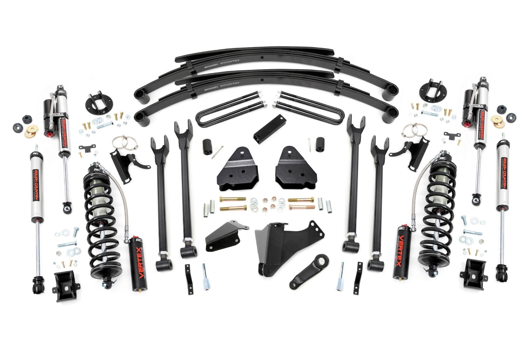 Superior Ride Quality. Give your first-generation Ford Super Duty an impressive upgrade and incredible ride quality with Rough Country's 4-Link Coilover Conversion Lift Kit! This must-have kit is the pinnacle of suspension upgrades. Providing ride height adjustability, increased dampening, and killer good looks. You're sure to set yourself apart from the pack. This innovative kit allows you to replace your factory arms with a 4-Link setup, using Rough Country's durable, fixed upper arms and adjustable lower control arms. A set of radius arm drop brackets maintain proper geometry and allow for proper caster setting, which is crucial to maintaining factory handling.\ Durable Components. Rough Country's 6" 4-Link Coilover Conversion Lift Kit features top-mounted reservoir brackets and coil-over mounts constructed from 1/4-inch steel. Utilizing this conversion kit you're removing the factory independent coil shock and coil set-up and replacing it with a massive 2.5in piston, nitrogen-charged, 8-stage adjustable Vertex Coilover. Rough Country's Vertex Coilovers feature a monotube design with an external reservoir for increased oil capacity and damping sensitivity. When it comes to investing in a high-end kit, you'll be pleased to find that Rough Country's 2.5in piston design is beefier and offers an impressive 56% greater fluid capacity than the average reservoir shock. Each kit is paired with a monotube shock that provides optimal damping control.\ Installation. Requiring cutting and drilling to install, an estimated timeframe of 6-10 hours is recommended to complete this full installation. This full kit can be installed at home and can be completed efficiently and quickly!\ Limited Lifetime Replacement Warranty. Rough Country's 4-Link Coilover Conversion Lift Kit is backed with a limited lifetime replacement warranty towards manufacturer defects. As such, the product is protected from structural and workmanship damage after the date of purchase. With our industry-leading warranty give yourself peace of mind when using Rough Country's Suspension products!