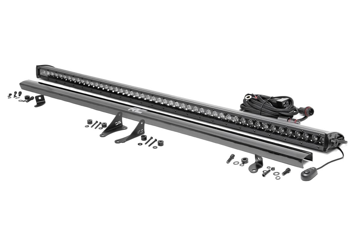 COMMAND THE DARK with Rough Country's 50in LED Hood Kit! This awesome, easy-to-install LED upgrade gives your Jeep JL a menacing look and incredible off-road illumination.This kit features Rough Country's 50in, straight, single-row LED light bar for a sleek look that leaves plenty of visibility while blending in perfectly with the JL's aggressive front-end design. This setup provides a staggering 19,200 lumens and 240 watts of forward-facing LED power and is available in your choice of Chrome-Series or Black-Series LED for the style that suits your build the best! Each Rough Country LED light bar is IP67 Waterproof and includes a premium, braided wiring harness with in-line fuse and on/off switch!This easy-to-install kit features a 100% bolt-on installation procedure, with no need for cutting or drilling on your brand new Jeep, and does not interfere with the windshield washer nozzle or spray pattern! Includes Rough Country's 3-year LED warranty and lifetime mounting bracket warranty!