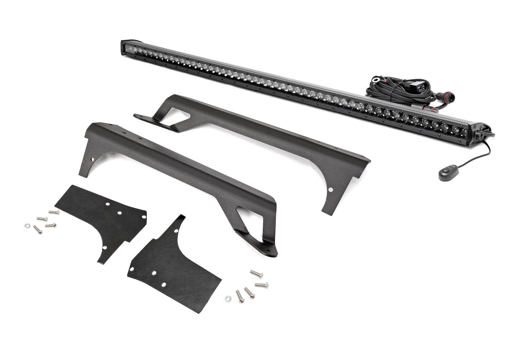 With durable steel construction and aggressive good looks, Rough Country's 50-inch LED Upper Windshield Light Bar Bracket is the ultimate solution for adding our premiere lighting system to your Jeep TJ. With its modern, stylistic design and superior strength, this upper windshield mount holds your 50-inch Light Bar between the top of your Wrangler's windshield and roof, spanning the entire width of the roof and giving a killer look. Fits any standard 50-inch Off-Road LED Light.