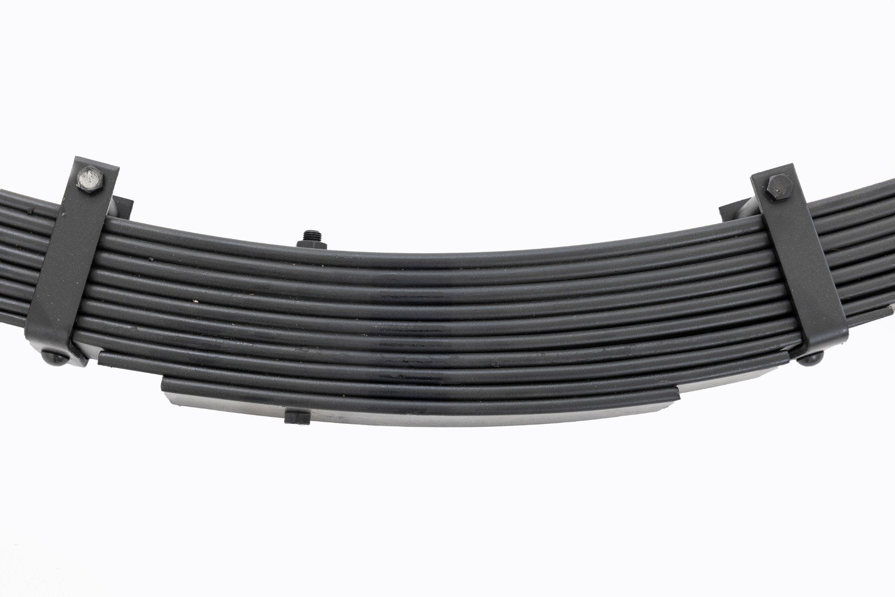 Added Lift Height and Ride Comfort. Take your suspension kit to the next level with Rough Country's Replacement Leaf Springs. Constructed from high-quality materials and designed specifically for the weight of your vehicle. This enhanced replacement spring will provide a factory-like feel while retaining your suspension lift height.a\ Durable and Off-Road Ready. Rough Country's Replacement Leaf Springs are designed to tackle any terrain that they are faced with. Featuring a multi-leaf design and spring pads this reduces the friction and maximizes comfort. Each leaf pack utilizes tapered leaves for improved flexibility at their ends.a\ Installation. Rough Country's Replacement Leaf Springsaoffer a 100% bolt-on installation estimated to take approximately 1-2 hours depending on vehicle condition. Simply remove the pre-existing leaf spring and use the stock hardware to equip your vehicle with this high-quality replacement.a\ Lifetime Replacement Warranty. Rough Country's Replacement Leaf is backed with a 5-year replacement warranty towards manufacturer defects. As such, the product is protected from structural and workmanship damage after the date of purchase. With our industry-leading warranty give yourself peace of mind when using Rough Country's Suspension products!a