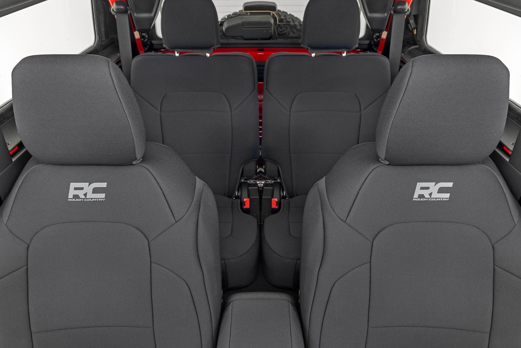 Want to protect your seats or are your seats showing signs of wear and tear from daily use? Say goodbye to unsightly stains and deterioration with Rough Country's Neoprene Seat Covers - the ultimate solution for preserving your vehicle's interior.Snug Fit for Optimal Protection: Our seat covers are tailored to fit your seats perfectly, providing a protective barrier against spills, scratches, and everyday wear and tear.Factory-Spec Construction: Engineered to meet factory specifications, our covers blend seamlessly with your vehicle's interior, giving it a fresh, new look without compromising on quality or style.Four-Layer Defense: With a four-layer construction featuring foam padding and a durable polyester shell, our seat covers offer unmatched protection and longevity, ensuring your seats stay looking new for years to come.Breathable and Water-Resistant: The neoprene layer not only provides breathability for added comfort but also boasts water-resistant properties, safeguarding your seats from spills and stains.Complete Coverage: Our covers come with full protection for your front seats, including headrest covers where applicable, as well as rear covers to shield your back seats from children and pet-related mishaps.Peace of Mind Warranty: Rest easy knowing your purchase is backed by our two-year warranty, giving you confidence in the durability and reliability of our product.Don't let worn-out seats diminish your driving experience. Upgrade to Neoprene Seat Covers today and enjoy a fresh, stylish interior that's protected against the rigors of daily life on the road.